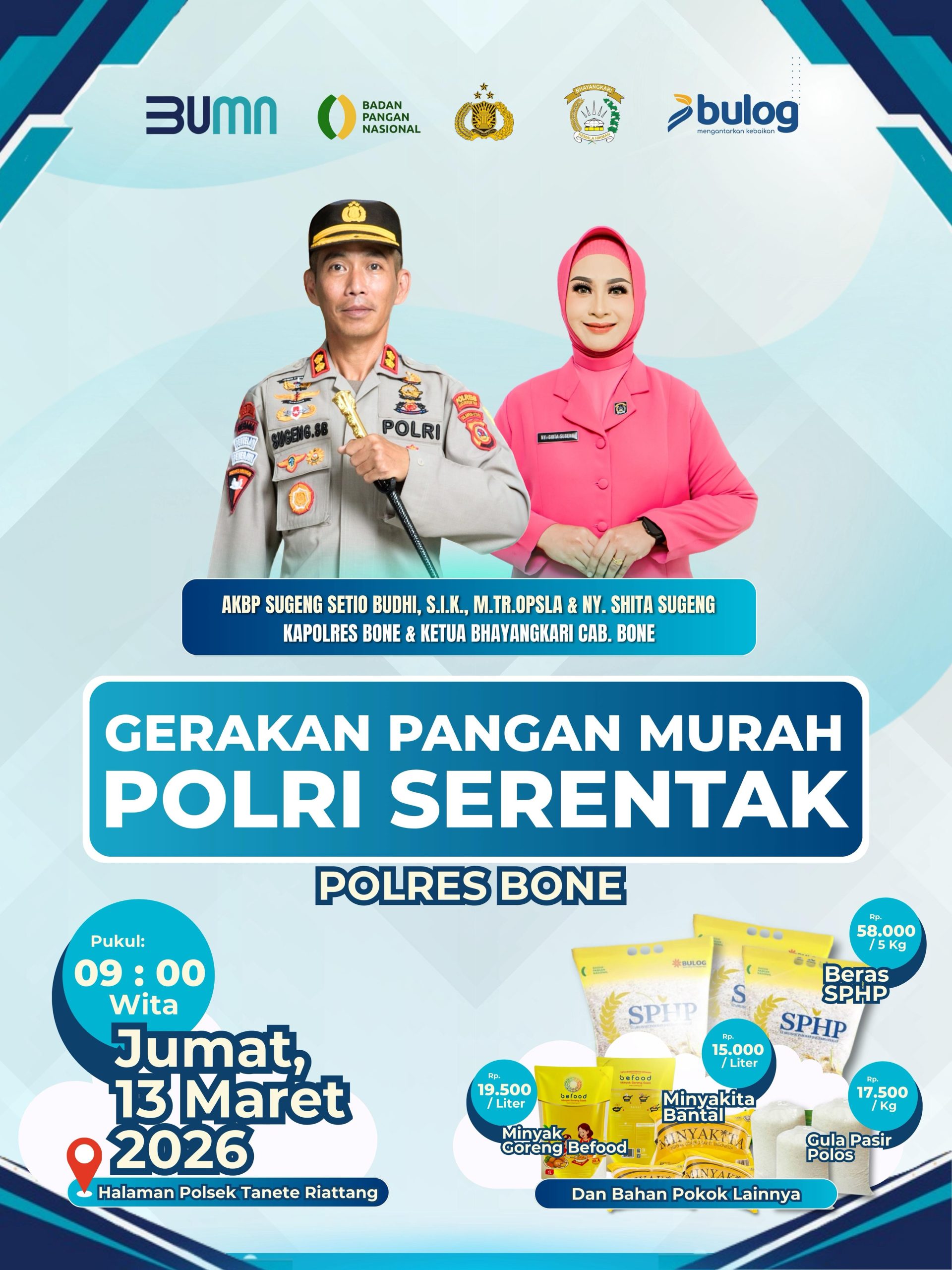 Di wilayah hukum Polres Bone Polda Sulawesi Selatan, kegiatan Gerakan Pangan Murah tersebut akan dipusatkan di halaman Kantor Polsek Tanete Riattang, Jalan M.H. Thamrin No. 2, Watampone. Kegiatan ini merupakan hasil kerja sama Polri dengan sejumlah instansi dan lembaga, di antaranya BUMN, Badan Pangan Nasional, serta Perum Bulog, sebagai bentuk sinergi dalam menjaga stabilitas harga dan ketersediaan bahan pangan bagi masyarakat.